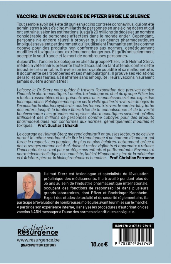 Aujourd’hui, l’ancien toxicologue en chef du groupe Pfizer, le Dr Helmut Sterz, médecin vétérinaire, présente l’acte d’accusation tant attendu contre cette industrie très rentable. Il révèle son incroyable cupidité et sa malhonnêteté. Il documente ses tromperies et ses manipulations. Il prouve ses violations de la loi et ses fautes. Et il affirme sans ambiguïté : leurs vaccins n’auraient jamais dû être administrés !