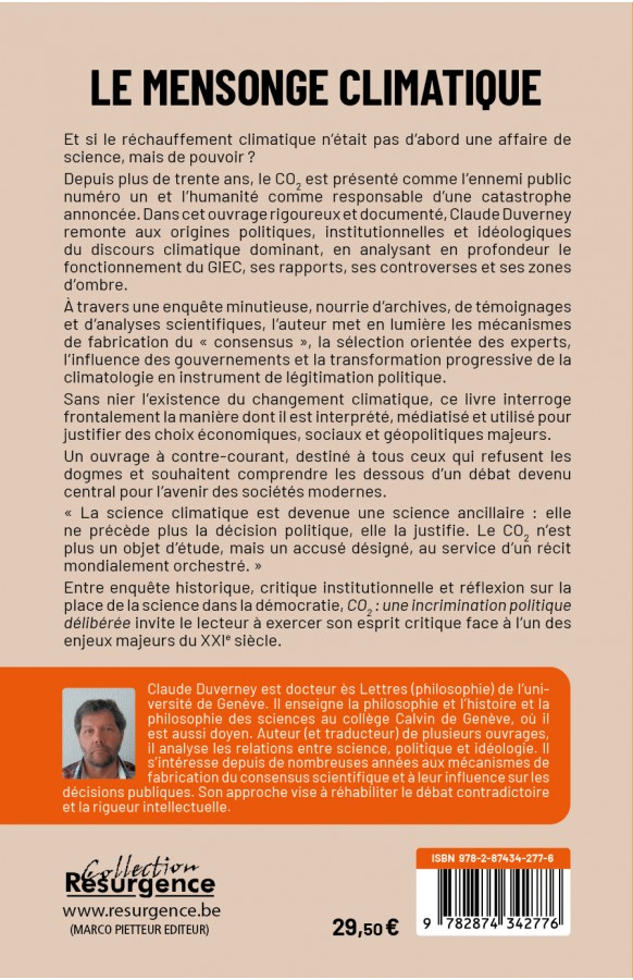 Depuis plus de trente ans, le CO₂ est présenté comme l’ennemi public numéro un et l’humanité comme responsable d’une catastrophe annoncée. Dans cet ouvrage rigoureux et documenté, Claude Duverney remonte aux origines politiques, institutionnelles et idéologiques du discours climatique dominant, en analysant en profondeur le fonctionnement du GIEC, ses rapports, ses controverses et ses zones d’ombre.